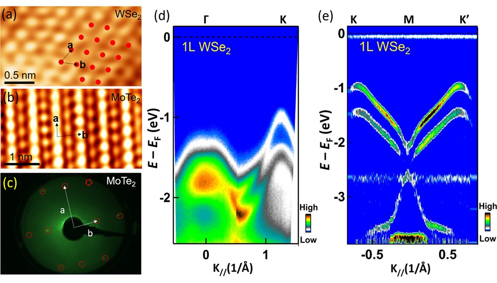 图4. 在大面积的单层样品上获得的原子图像、低能电子衍射斑点及能带结构图。