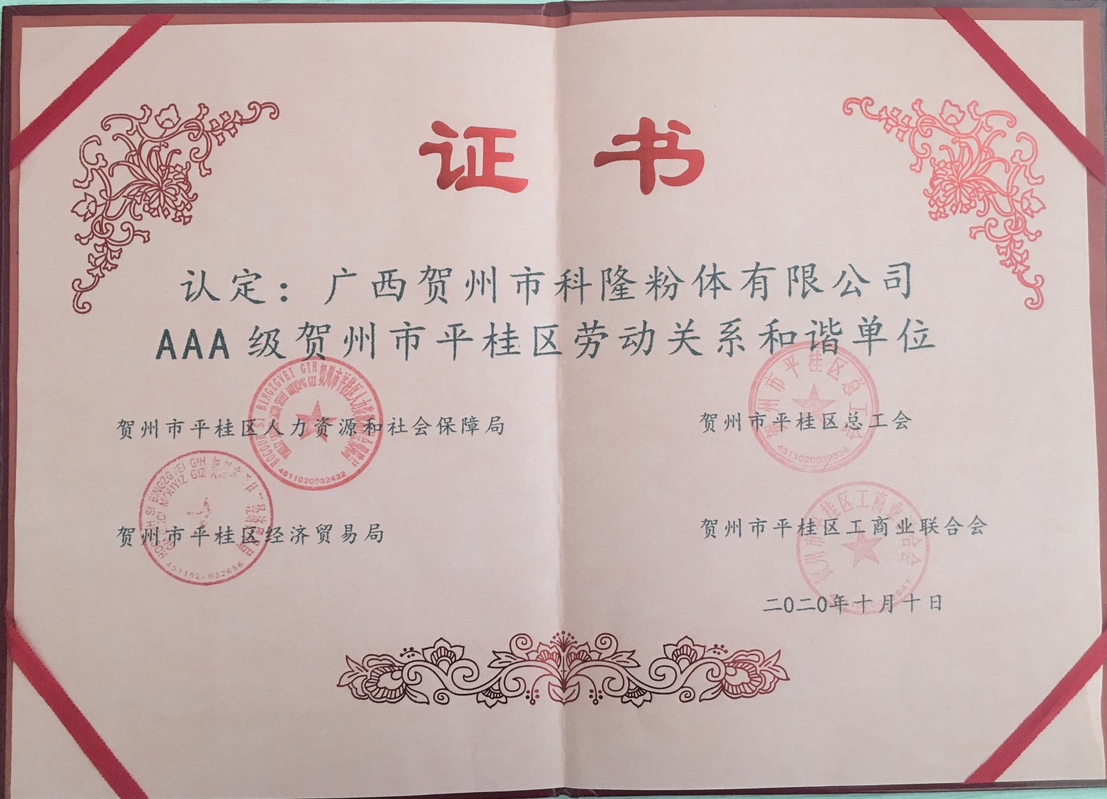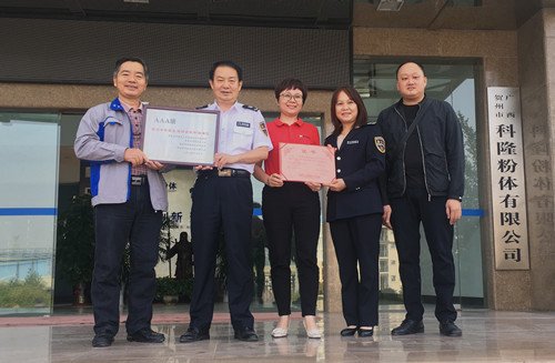 11月6日,贺州市平桂区人力资源和社会保障局在科隆粉体有限公司举行了授匾仪式,为该公司颁发贺州市平桂区“AAA级劳动关系和谐单位”牌匾及荣誉证书。