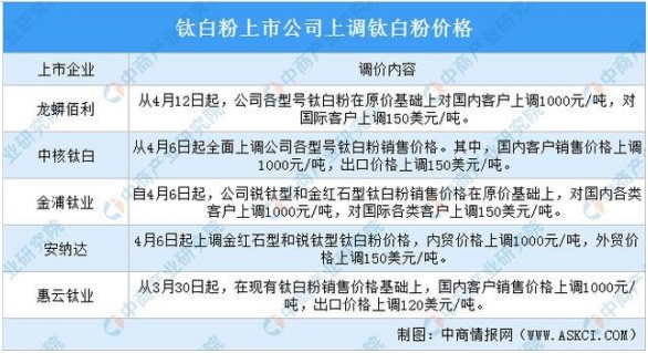 从3月底开始,随着惠云钛业率先涨价,钛白粉市场开启今年以来新一轮涨价潮。截至目前,中核钛白、金浦钛业、龙蟒佰利等20余家企业先后宣布上调钛白粉价格,从价格信息来看,钛白粉国内市场涨幅在每吨1000元至1500元,外销价涨幅在每吨120美元至200美元。