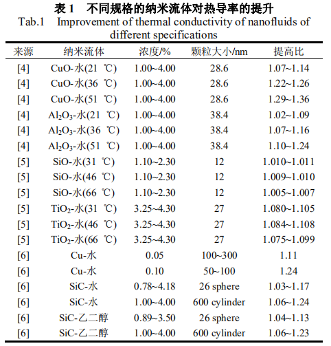 从近年来的研究可以看出,纳米流体导热系数变化存在很多规律,这激发了研究者对其内在机制进行研究的兴趣。尽管在该领域已经有很多研究成果,但因其影响因素繁多,一些研究结果仍备受争议。这其中包括纳米颗粒的布朗运动、固/液界面形成的分子层、以及杂化纳米流体颗粒的协同作用等。纳米颗粒对流体热导率的提升,国内外已有众多研究人员做了相关实验研究,并得到了大量实验数据,如表1。