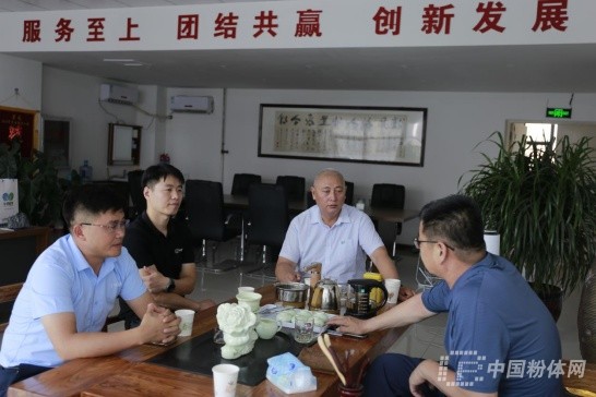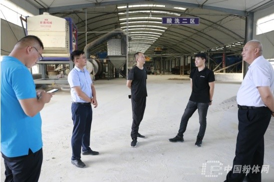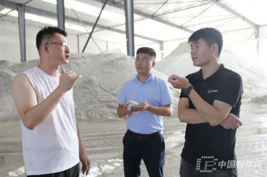 中天石英砂郝总与粉体网宋总、百特光电涂总在车间交流