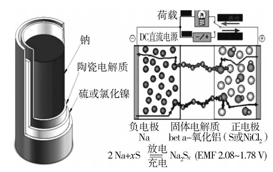 钠硫电池的模型及工作原理如图1所示。目前钠硫电池结构主要设计为管式。电池由熔融电极和固体电解质组成,负极活性物质为熔融金属钠,正极活性物质为液态硫和多硫化钠熔盐,固体电解质兼隔膜为一种能够传导钠离子的被称为Beta氧化铝的陶瓷材料,外壳则一般采用不锈钢、铝合金等金属材料。