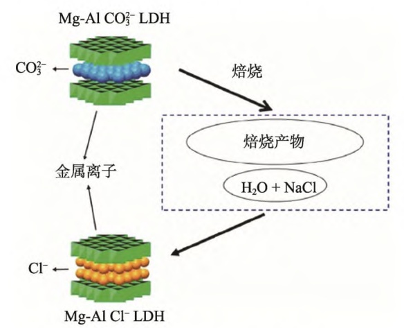 将焙烧后的MgAl-LDH加入含有某种阴离子的溶液中,水滑石被破坏的层状结构可以部分恢复有序层状结构。