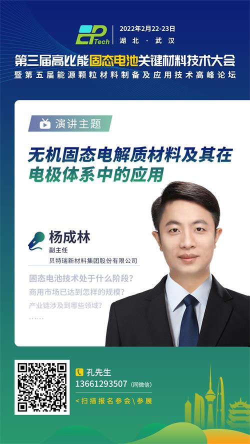 为推动固态电解质产业化,促进行业交流,2022年2月22-23日,由www.188betkr.com 主办的“第三届高比能固态电池关键材料技术大会”将于湖北武汉东方建国大酒店举办,届时将邀请来自贝特瑞新材料集团股份有限公司的杨成林博士作《无机固态电解质材料及其在电极体系中的应用》报告。本报告主讲人将介绍贝特瑞固态电池团队的研发进展,包括无机固态电解质LATP/LLZO粉体、浆料等产品的物相、粒度、离子导率等特性;无机固态电解质材料在包覆正极活性材料方面的应用;一种与固态电池体系相匹配的电极评价方法。
