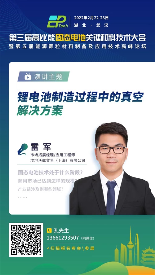 随着锂电池由液态至固态的产业化升级,真空系统也随电池的制造过程中的变化而变得更加丰富多样,且与电池的性能关系越来越密切。2022年2月22-23日,由www.188betkr.com主办的“第三届高比能固态电池关键材料技术大会”将于湖北武汉东方建国大酒店举办,届时将邀请来自埃地沃兹贸易(上海)有限公司的市场拓展经理雷军作《锂电池制造过程中的真空解决方案》报告。报告主讲人将聚焦锂电池产业升级中的真空应用深入讨论,并介绍Edwards锂电池行业的真空解决方案。