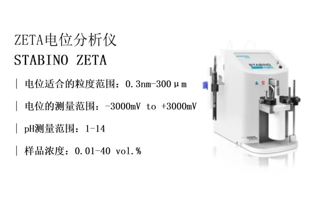 此款纳米粒度仪可以配合刚上市的Zeta电位分析仪STABINO ZETA使用,能够实现不同溶液环境下的粒度测量以及Zeta电位测量。通过自动滴定的方式能够快速的对不同配方的稳定性进行评价,主要应用如下: