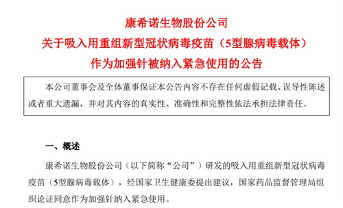 1、证券时报:“黏膜免疫”获认可!康希诺全球首款吸入用新冠疫苗获批紧急使用