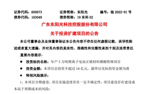 www.188betkr.com 讯9月8日,东阳光公告,乳源新能源公司计划在广东省韶关市投资扩建年产5万吨锂离子电池正极材料磷酸铁锂项目,项目总投资额预计不超过14亿元。