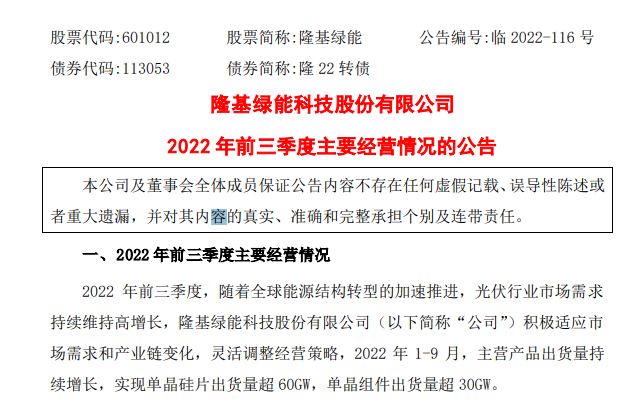 www.188betkr.com 讯10月24日晚间,隆基绿能发布2022年前三季度主要经营情况的公告,公告表示,2022年1-9月,主营产品出货量持续增长,实现单晶硅片出货量超60GW,单晶组件出货量超30GW。