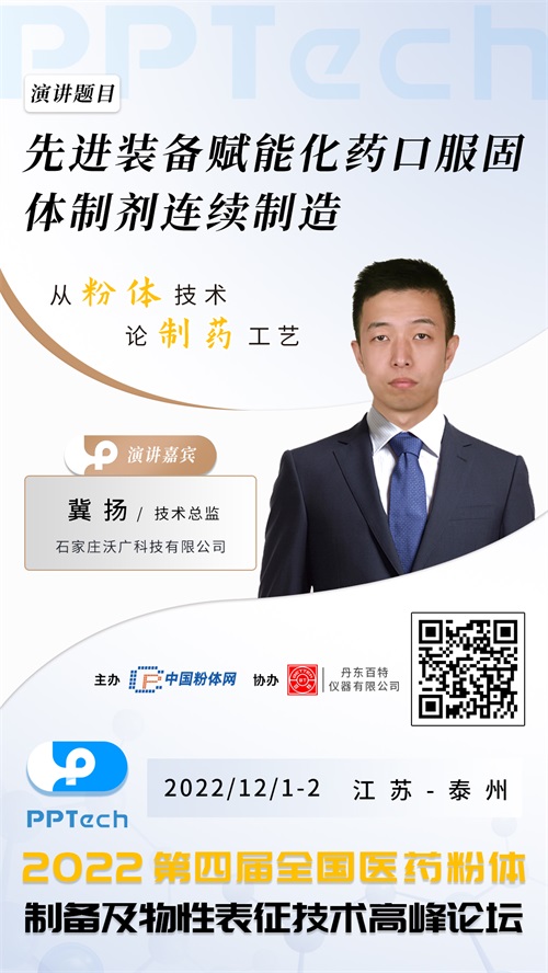 2022年12月1-2日,www.188betkr.com 将在江苏泰州碧桂园凤凰酒店举办“第四届全国医药粉体制备及物性表征技术高峰论坛”,届时将邀请来自石家庄沃广科技有限公司的技术总监冀扬先生作《先进装备赋能化药口服固体制剂连续制造》报告,报告主讲人将为大家详细介绍连续制造在口服固体制剂中的研究与应用,以期为口服固体制剂连续制造研究提供参考。