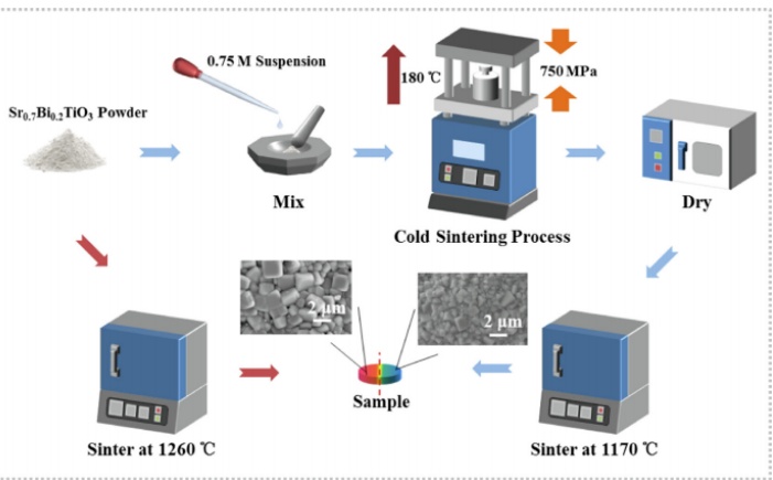 该团队利用溶液燃烧合成法合成的纳米粉体制备了Sr0.7Bi0.2TiO3(SBT)陶瓷,采用两步法结合CSP和CS方法系统地研究了SBT陶瓷的显微结构、介电性能和储能性能。图1所示。