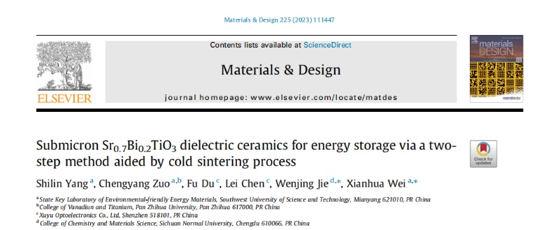 相关成果以“Submicron Sr0.7Bi0.2TiO3dielectric ceramics for energy storage via a two-step method aided by cold sintering process”为题发表在国际材料领域著名期刊《Materials & Design》(DOI:10.1016/j.matdes.2022.111447)上。该论文第一作者为硕士研究生杨仕林,通讯作者为魏贤华教授,西南科技大学环境友好能源材料国家重点实验室为论文第一作者单位和通讯作者单位。