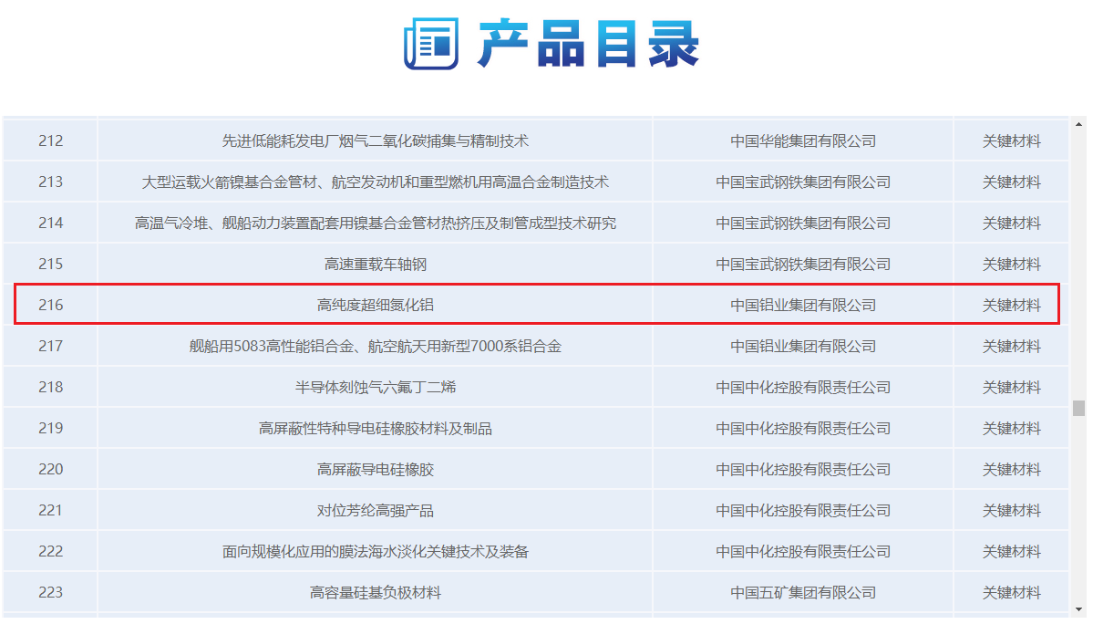 www.188betkr.com 讯为加快中央企业科技创新成果应用推广,促进科技成果向现实生产力转化,国资委科创局组织开展科技创新成果征集遴选工作。经企业报送与专家评审,编制了《中央企业科技创新成果推荐目录(2022年版)》。近日,该目录也是进行了发布,目录包括核心电子元器件、关键零部件、分析测试仪器、基础软件、关键材料、先进工艺、高端装备等7个领域369项技术产品,其中中国铝业集团有限公司所属中铝新材料有限公司自主研发生产的高纯度超细氮化铝(AlN)粉体成功入选。