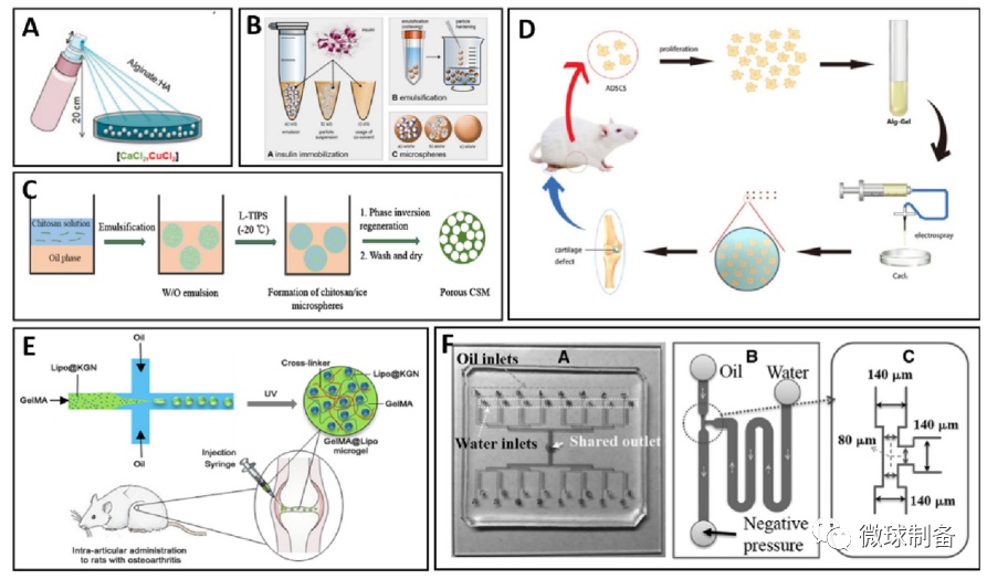 图片水凝胶微球制备技术示意图。A喷雾法、B乳液聚合、C相分离、D电喷雾、E微流体技术、F微流控芯片