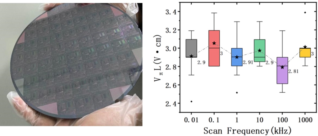 通过“万能离子刀”技术,铌酸锂薄膜可与硅光芯片实现大面积低缺陷密度的集成,两者结合展现出优良的电光调制性能。如图3为异质集成XOI团队孵化的上海新硅聚合制备的八英寸硅基铌酸锂异质晶圆,验证了该工艺路线进一步扩展至八英寸的可行性,未来可实现大规模的商业化制备。目前,上海新硅聚合已经实现六英寸光学级硅基铌酸锂异质晶圆的量产和数千片批量供应(占有率超过80%),目前正在推动八英寸晶圆的工程化技术。