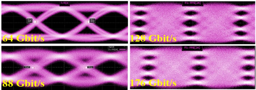 得益于优良的材料质量和器件制备技术,器件在10 Hz至1MHz频率范围内的三角波电压信号下的调制效率测量结果如图2(b)所示,结果显示在测量频率范围内器件保持稳定的VpiL值,约2.9 V·cm,与仿真值2.92V·cm相接近。同时该结果展示器件具备较好的低直流漂移特性,证明薄膜铌酸锂材料和氧化硅包层的沉积质量较好,缺陷较少。调制器的光眼图测试结果如图2(c,d)所示,在NRZ调制信号下传输速率达到88Gbit/s, PAM-4调制信号下传输速率达到176 Gbit/s。