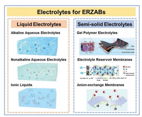 作为离子导体的电解质是锌-空气电池的核心部件之一,因为它在放电-充电过程中起着重要作用,并极大地影响电池的可充电性、工作电压、寿命、功率密度和安全性。