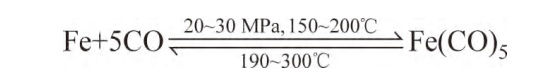 工业上生产羰基铁粉最成熟的工艺为高压气相合成法,其合成压力超过20MPa,反应温度为150~200℃,反应时间>120h,分为高压合成和热分解制粉两大工序。两个反应可表示为: