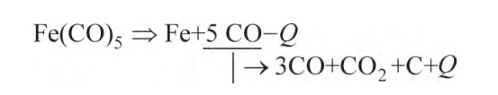 该反应属于吸热反应,当铁核形成后,铁核周围的Fe(CO)5浓度降低,CO浓度增高,温度下降,其结果使分解反应减慢。但在这瞬间,由于活性铁的催化作用,促使紧靠铁核周围的一氧化碳分解反应进行并放出热量,铁核周围的CO浓度降低,温度升高,分解析出的碳吸附在铁核表面,降低了铁的触媒作用,使CO的分解反应缓慢,Fe(CO)5的浓度增高到初期浓度,分解反应又重新开始,如此周而复始,形成的铁粉呈葱头状球形结构。粒度越大,葱层越多。