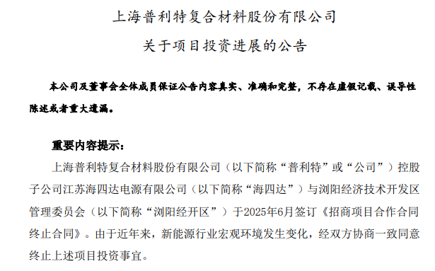 www.188betkr.com 讯7月1日,上海普利特复合材料股份有限公司(以下简称“普利特”或“公司”)发布公告,控股子公司江苏海四达电源有限公司(以下简称“海四达”)与浏阳经济技术开发区管理委员会(以下简称“浏阳经开区”)于2025年6月签订《招商项目合作合同终止合同》。