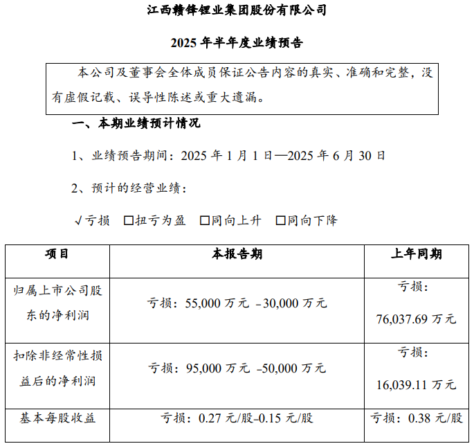 赣锋锂业预计,上半年实现归属上市公司股东的净利润为亏损3.00亿元~5.50亿元,上年同期为亏损7.60亿元;扣除非经常性损益后的净利润为亏损5.00亿元~9.50亿元,上年同期为亏损1.60亿元。