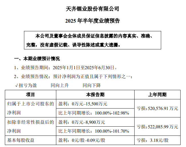 天齐锂业预计上半年归属于上市公司股东的净利润为0万元至1.55亿元,而上年同期为亏损50.06亿元,预计扭亏为盈。