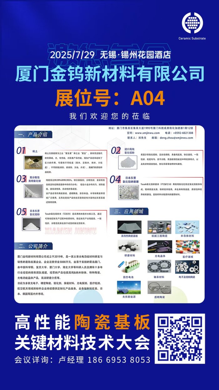 高性能陶瓷基板关键材料技术大会将于2025年7月29日在江苏无锡举办。厦门金钨新材料有限公司作为参展单位邀请您共同出席。