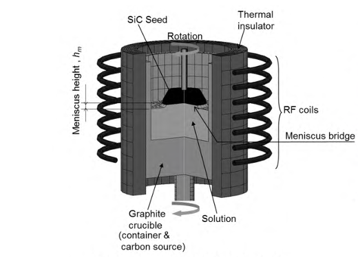 液相法常用的是顶部籽晶溶液生长法(TSSG),生长温度通常在2073K左右,比PTV法的生长温度低。在生长过程中,把籽晶固定在吊杆上,通过对石墨坩埚中含有Si的助熔剂进行加热使之成为熔融态,而石墨坩埚则为晶体生长提供C源,溶液随着坩埚内部的对流流向籽晶方向,传输到籽晶表面进行SiC晶体的生长。