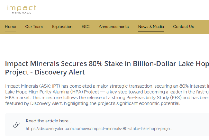 Impact Minerals董事总经理Mike Jones博士表示:“此次交易对Impact来说是一个重要的里程碑。预可行性研究的完成证实,Lake Hope 有潜力成为一家具有全球竞争力、低成本且可扩展的 HPA 生产商。凭借简单且资本效率高的工艺流程、强劲的利润率和极小的碳足迹,Lake Hope为我们提供了一条途径,使我们在市场进入快速增长期时成为 4N 高纯氧化铝的主要供应商。”
