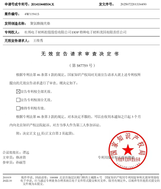 近日,国家知识产权局消息,杜邦电子材料控股股份有限公司、杜邦全资子公司DDP特种电子材料美国有限责任公司拥有的一项名为“聚氨酯抛光垫”的专利(专利号:ZL201410448504.X)因不具备创造性,而被宣告权利要求全部无效。