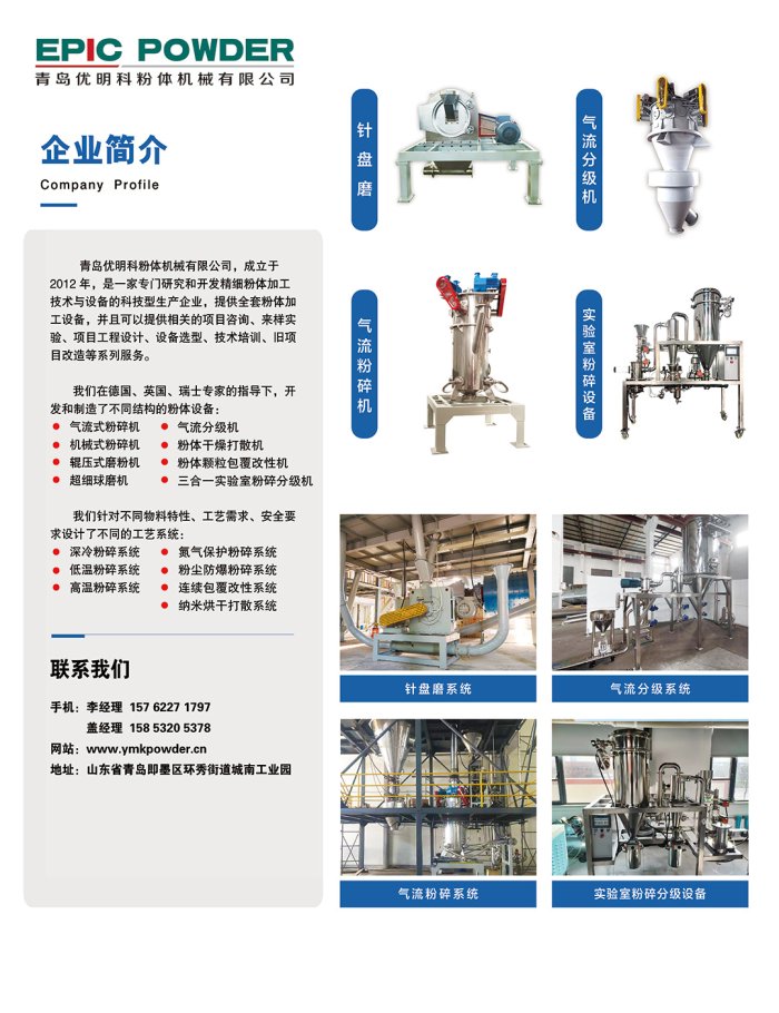 青岛优明科粉体机械有限公司,成立于2012年,是一家专门研究和开发精细粉体加工技术与设备的科技型生产企业,提供全套粉体加工设备,并且可以提供相关的项目咨询、来样实验、项目工程设计、设备选型、技术培训、旧项目改造等系列服务。