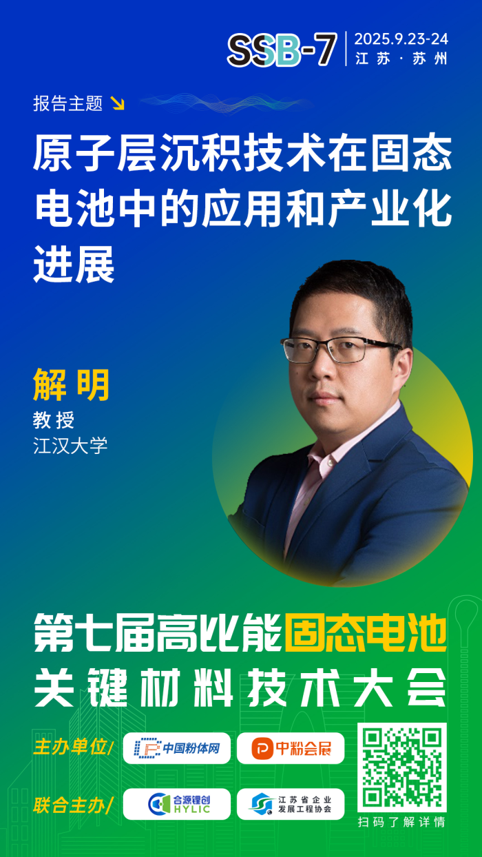 针对固态电池产业化发展现状,www.188betkr.com联合合源锂创、江苏省企业发展工程协会将于2025年9月23-24日在江苏· 苏州举办第七届高比能固态电池关键材料技术大会。为致力于固态电池技术开发的企业,科研院校,以及新能源汽车、储能、消费电子等终端企业提供信息交流的平台,开展产、学、研合作。届时,来自江汉大学的解明教授将作题为《原子层沉积技术在固态电池中的应用和产业化进展》的报告。