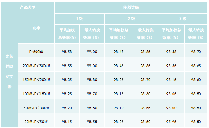 逆变器:分功率段定标准:500kW以上集中式逆变器1级平均加权总效率≥98.58%,20-50kW组串式逆变器1级效率≥98.15%,精准覆盖不同应用场景,确保发电全链路能效最优。