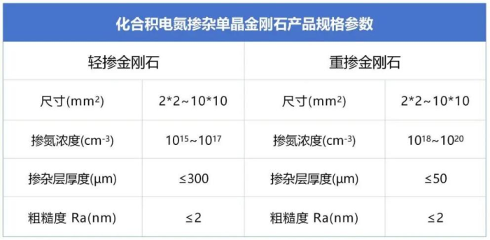 氮掺杂单晶金刚石(n型掺杂)集超高热导率、高纯度NV中心、低缺陷晶体层等核心性能于一体,可广泛应用于高功率电子、量子信息、生物成像与高端光子学等领域。化合积电在氮掺杂单晶金刚石的技术研发上持续发力,已实现浓度可控、可定制化的氮掺杂工艺,匹配客户对电学、量子及光学性能的严苛需求。