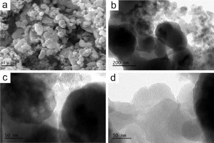 以锆硅渣为硅源合成的MCM-41的SEM (a)和TEM (b,c,d)图像