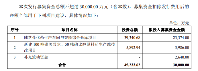 此次募资的主要用途包括:投资陆芝葆化药生产车间与智能综合仓库项目,以提升生产能力和仓储智能化水平;新建100吨碘美普尔和50吨碘比醇原料药生产线技改项目,以扩大原料药生产规模并提升技术水平;剩余部分资金将用于补充公司流动资金,以增强公司资金流动性,支持日常运营及未来业务发展。