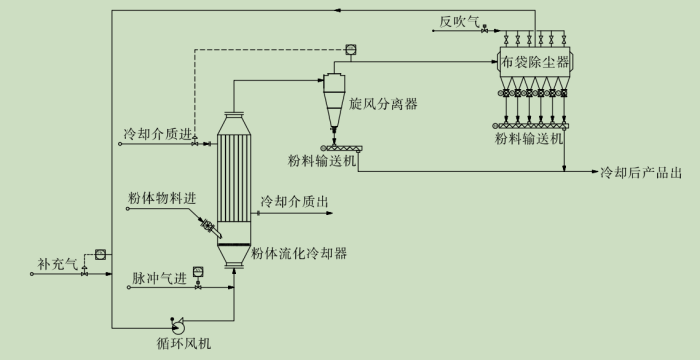 以卧式流化床为例,粉料在流态化状态下依次通过多个流化腔室,每个流化腔室下均有冷却气体通入,气体与粉料直接接触换热,达到逐级冷却的目的。换热后的气体从顶部引出,经旋风分离器和布袋除尘器后排空。也可以将气体间接冷却后循环使用。