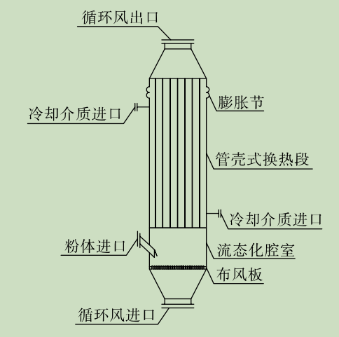 气固流化床具有传热系数高(可达200~400W/m2/K)、温度均匀可控、颗粒输送方便等特点,是目前较常用的一类冷却器。该技术是利用流态化原理,以空气或惰性气体为载体气,将粉料流化起来。