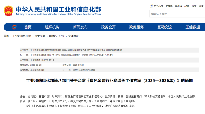 www.188betkr.com 讯9月28日,工业和信息化部联合自然资源部、商务部、中国人民银行、国务院国资委、海关总署、中国证监会和国家粮食和储备局等八部门印发《有色金属行业稳增长工作方案(2025—2026年)》。