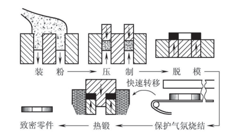 与传统锻造工艺不同的是,粉末锻造先利用粉末冶金方法制备具有一定形状的预成形坯,再将预成形坯置于保护气氛或真空环境下加热至一定温度,然后快速转移至经过预热的闭式锻模中进行锻造。