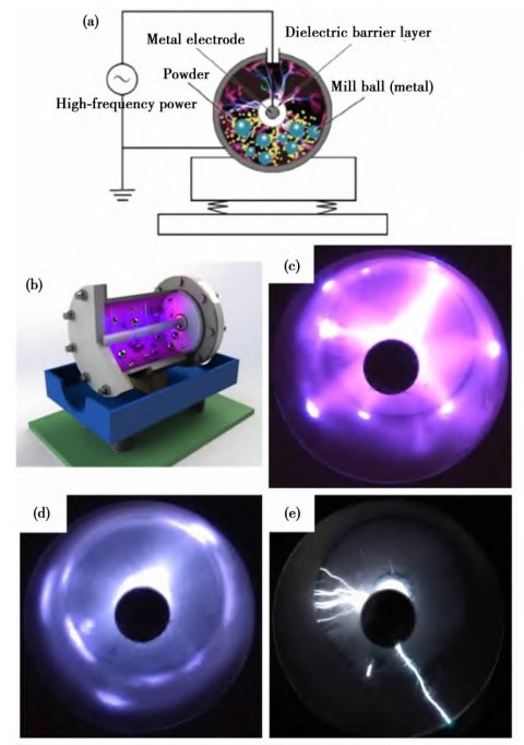 (a、b)等离子球磨技术的原理图;(c—e)不同气压条件下的Ar放电现象