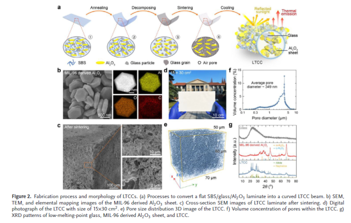 研究团队创新性地采用MIL-96衍生的分级结构氧化铝颗粒,该颗粒具有优化的几何参数和高孔隙率,能够增强光背向散射。将这些颗粒嵌入玻璃基质中,形成了低温共烧陶瓷(LTCC),在低于1000°C的温度下实现烧结,显著降低了能耗。