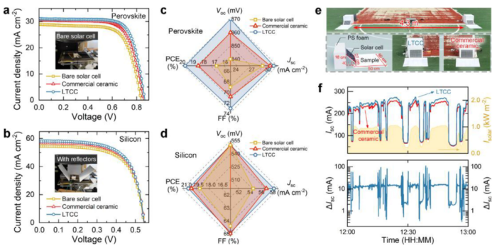 在光伏集成测试中,LTCC作为反射基底显著提升了钙钛矿和硅基太阳能电池的转换效率。户外实验中,LTCC使光伏模块在中午时段短路电流平均提升10.46 mA,且在阴天条件下仍能保持性能优势。
