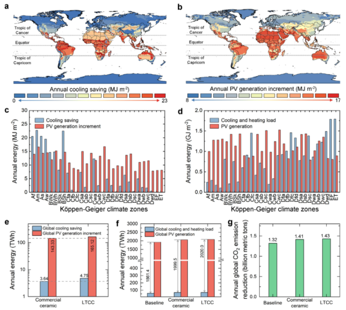 全球能源模拟显示,LTCC在赤道地区年冷却节能可达23 MJ/m?,光伏发电增量达17.6 MJ/m?。按气候分区分析,多数地区可实现冷却与光伏发电的平衡。整体来看,LTCC全球推广后年节电量可达4.75 TWh,光伏发电增量165.12 TWh,预计年二氧化碳减排量达14.3亿吨。
