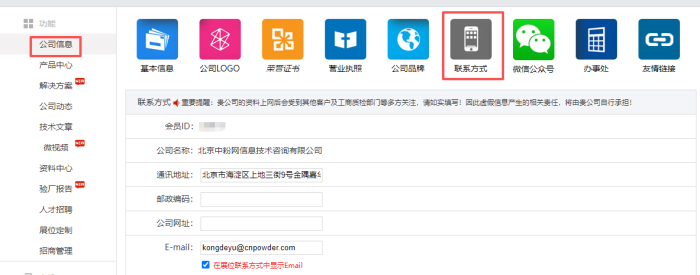 邮箱设置路径:企业后台-公司信息-联系方式,E-mail设置,填写后确认发布即可。