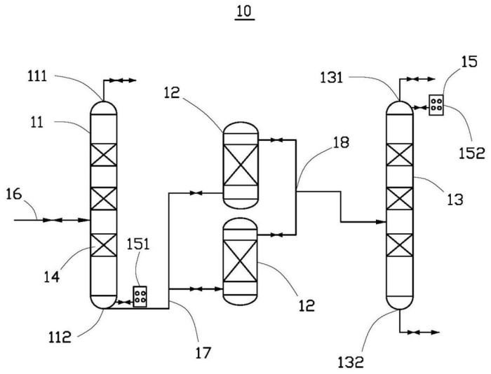 (主要元件符号说明:四氯化硅提纯系统10;脱轻塔11;脱轻塔顶采出口111;脱轻塔釜采出口112;吸附塔12;提纯塔13;提纯塔顶采出口131;提纯塔釜采出口132;加热盘14;气相色谱仪15;第一气相色谱装置151;第二气相色谱装置152;粗硅进料管16;吸附进料管道17;吸附出料管道18)