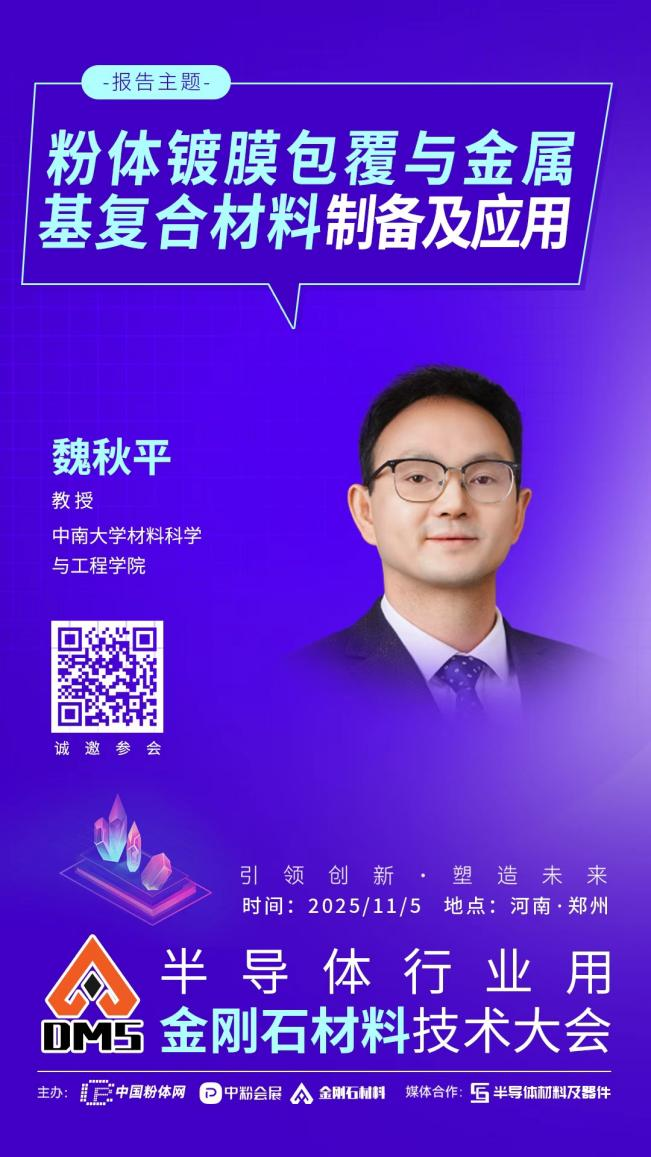 2025年11月5日,www.188betkr.com 将在河南?郑州举办“2025半导体行业用金刚石材料技术大会”。届时,我们邀请到中南大学魏秋平教授出席本次大会并作题为《粉体镀膜包覆与金属基复合材料制备及应用》的报告,报告将介绍真空镀膜技术及在金属复合材料界面优化研究中的应用,并就复合材料规模化制备中面临的界面缺陷控制及成本优化问题提出解决方案。