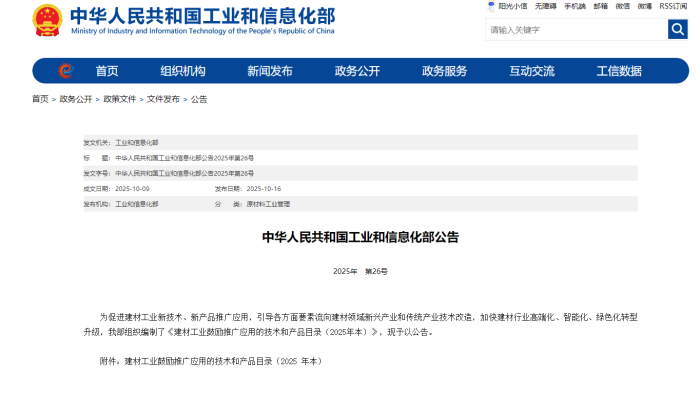 www.188betkr.com 讯近日,工业和信息化部发布《建材工业鼓励推广应用的技术和产品目录(2025年本)》。