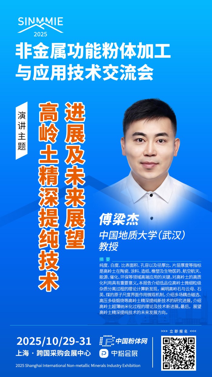 10月29-31日,北京粉体技术协会、柏德英思展览(上海)有限公司、山东中粉会展服务有限公司将在上海跨国采购会展中心联合主办“上海国际非金属矿工业展览会(SINMMIE2025)”,展会现场将同期举办“非金属功能粉体加工与应用技术交流会”,届时将邀请中国地质大学(武汉)傅梁杰教授作《高岭土精深提纯技术进展及未来展望》专题报告,介绍低品位高岭土分离技术,高岭石与云母、石英、煤的原子尺度界面作用微观机制,多场耦合磁选、高压多级煅烧等技术的研究进展,高岭土超薄纳米化过程的理论及技术新进展等。