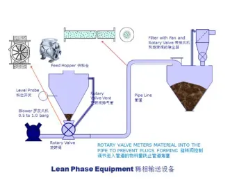 稀相输送系统,是通过一定流速的气体,使得固体粉料悬浮于输送管道中,通过气体的运动将物料输送到接收点。物料在管道中以悬浮状态运动,并通过收尘器进行气固分离。
